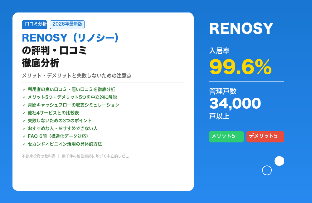 将来の資産形成と収益の安定化を目指して不動産投資を始めました。数あるサービスの中でRENOSYを選んだ理由は、物件選定から契約、管理まで一貫したサポート体制と、AIを活用したデータ分析による信頼性の高い提案が魅力だったからです。初心者でも安心して始められる環境が整っており、特に忙しい方にはおすすめです。購入を検討している方は、まず無料相談を活用し、自分の目的に合った投資スタイルを見つけることが重要です。RENOSYなら、効率的かつ着実に資産形成を進められると感じています。