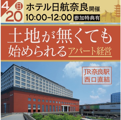 【ホテル日航奈良開催/参加特典有♪】土地が無くても始められるアパート経営。少額資金で始められる堅実な資産形成法とは